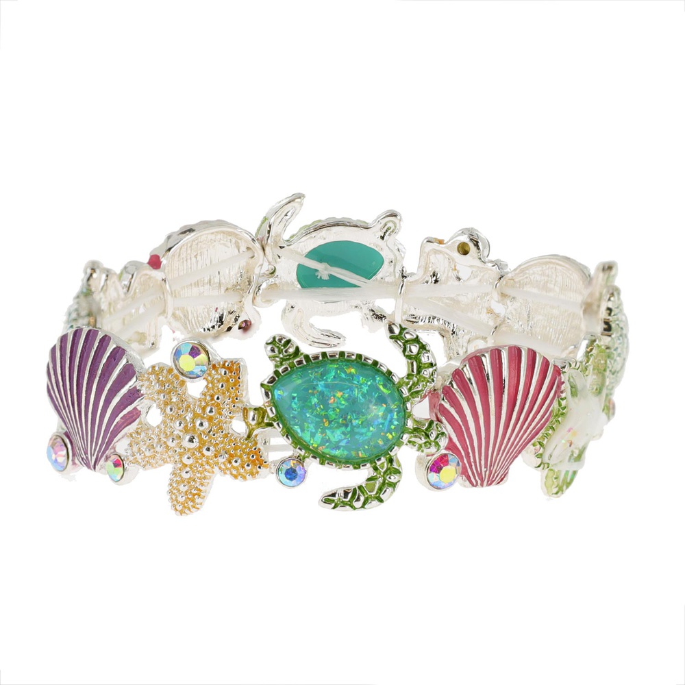 SEASHELL - SEA LIFE CRYSTAL RHINESTONE ENAMEL COATED GLITTER STRETCH BRACELET IN SILVER TONE METAL