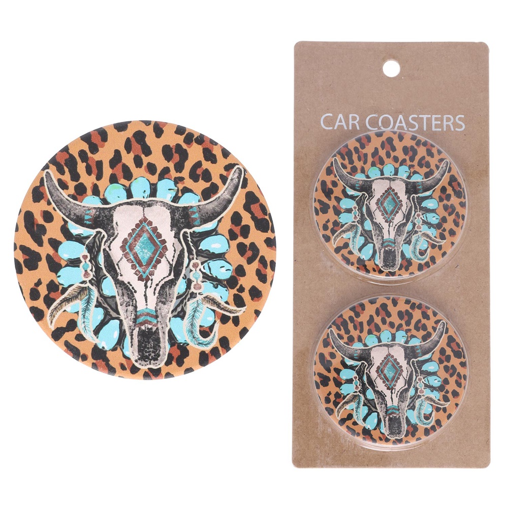 2-PIECE FARM LIFE LEOPARD PRINT LONGHORN SKULL CORK BASE CERAMIC ABSORBENT CAR COASTER SET