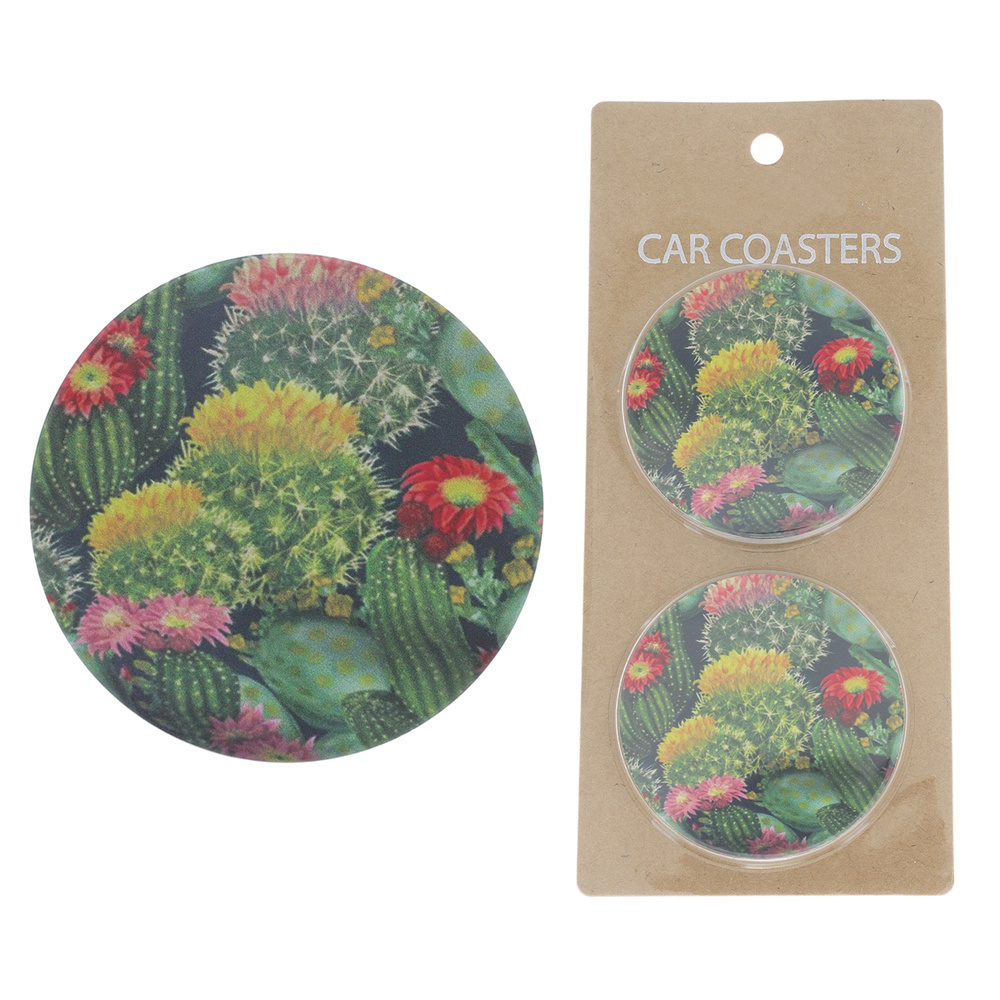 2-piece Cactus Print Cork Base Ceramic Absorbent Car Coaster Set
