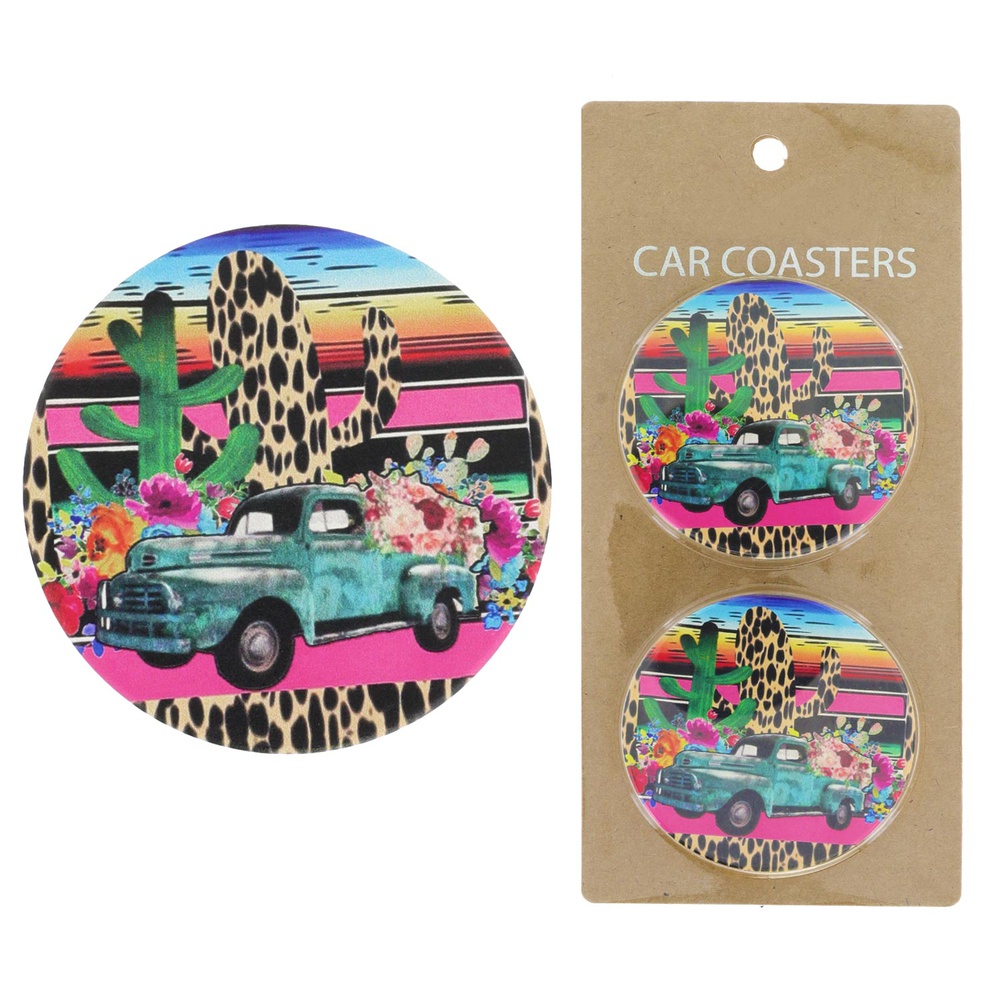 FLORAL PICK-UP TRUCK 2-PIECE CORK BASE CERAMIC ABSORBENT CUP HOLDER CAR COASTER SET