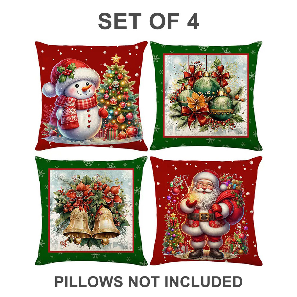HOLIDAY CUSHION COVERS SET OF FOUR WITH SNOWMAN SANTA BELLS AND ORNAMENT DESIGNS IN FESTIVE RED AND GREEN