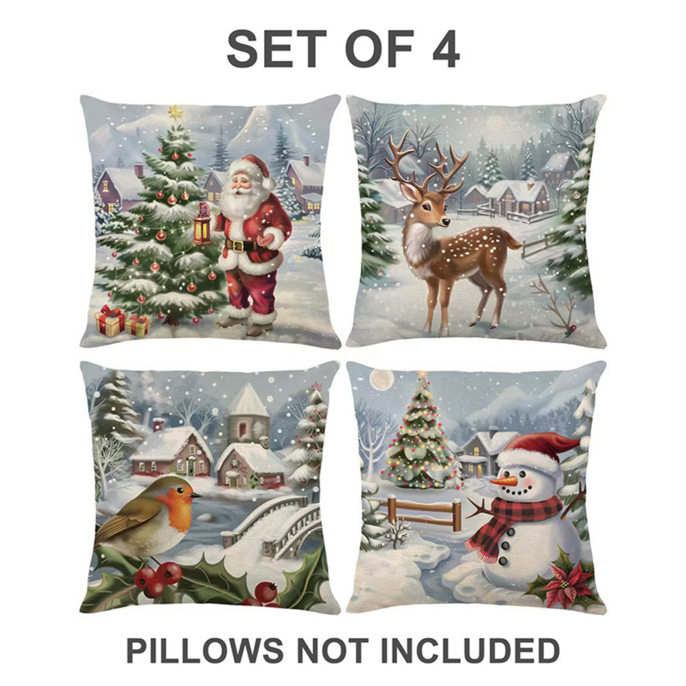 HOLIDAY CUSHION COVERS SET OF FOUR WITH SANTA REINDEER SNOWMAN AND WINTER VILLAGE DESIGNS