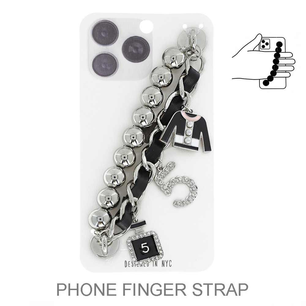 ENAMEL COATED CRYSTAL RHINESTONE PAVE MULTI CHARM BEADED AND LEATHER WOVEN CHAIN PHONE STRAP SET
