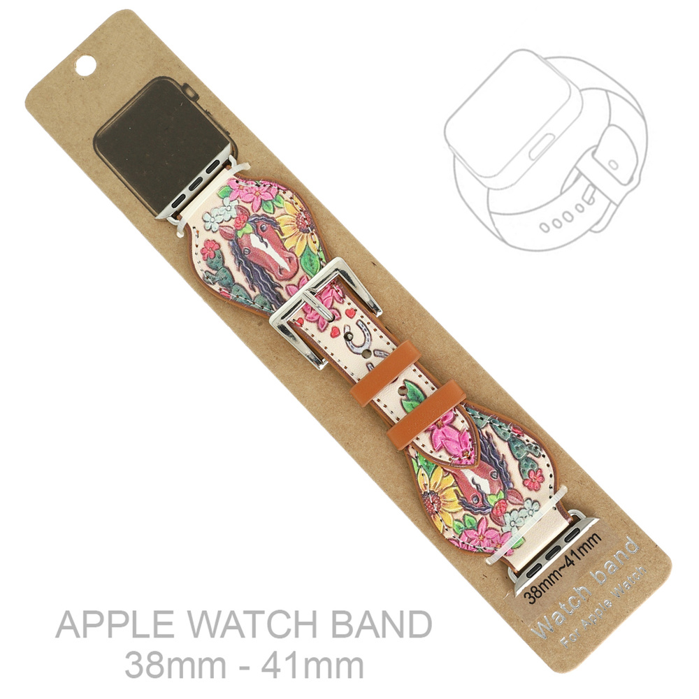 FLORAL HORSE TOOLED LEATHER APPLE WATCH BAND WITH PIN BUCKLE CLOSURE