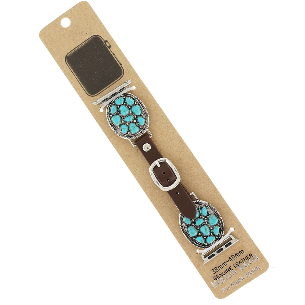 CLUSTER STONE-TURQUOISE SEMI-STONE WESTERN THEMED GENUINE LEATHER APPLE WATCH STRAP