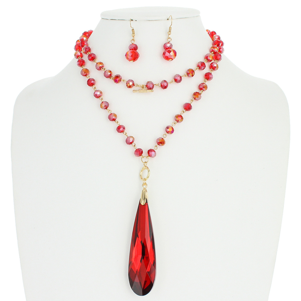 2 Line Beaded Necklace W/ Oblong Teardrop Necklace And Earrings Set