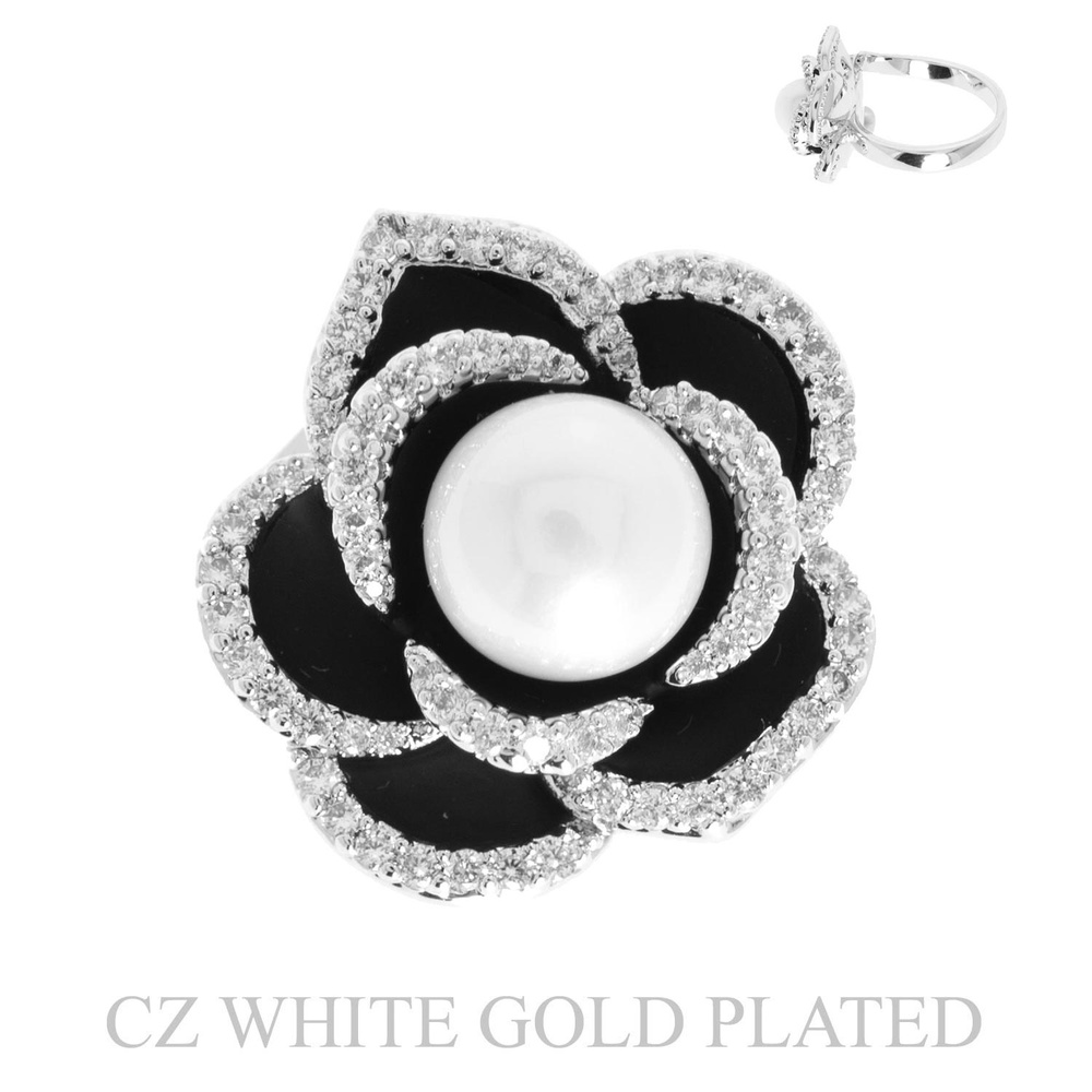 GOLD PLATED CUBIC ZIRCONIA ENAMEL COATED FLORAL RING IN WHITE GOLD PLATING