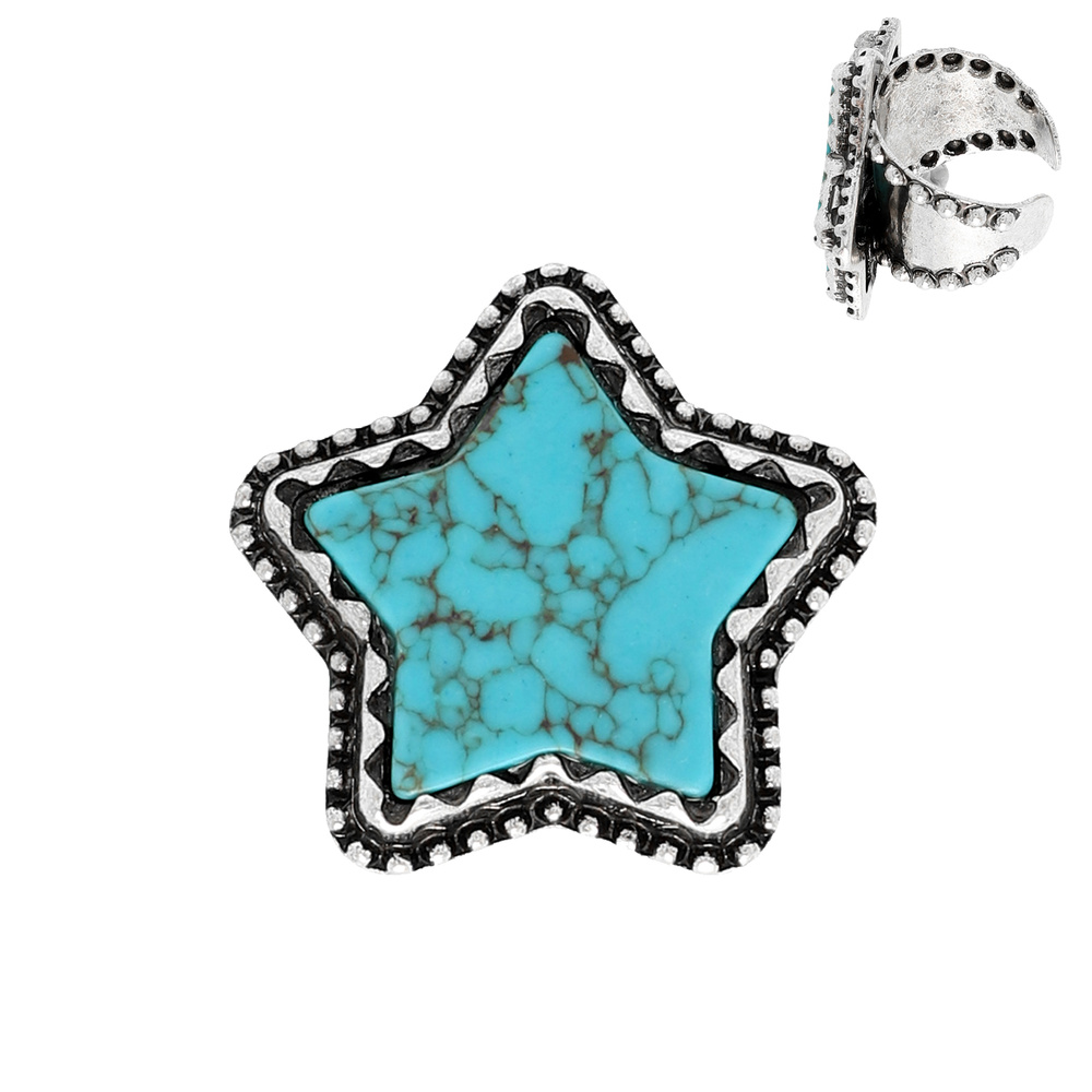 WESTERN FIVE-POINT STAR TURQUOISE CUFF RING IN OXIDIZED SILVER TONE METAL ADJUSTABLE ORNAMENT