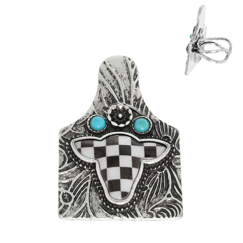 TURQUOISE EMBELLISHED CHECKERED FLAG PATTERN COW HEAD CATTLE TAG CUFF RING