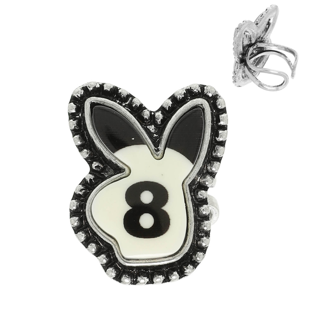 WESTERN BUNNY EIGHT BALL CUFF RING IN OXIDIZED SILVER TONE METAL