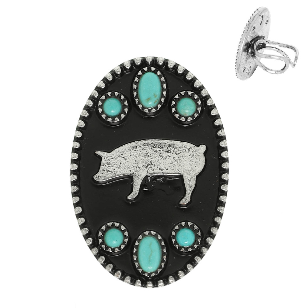 WESTERN PIG SILHOUETTE RING WITH TURQUOISE ACCENTS IN OXIDIZED SILVER TONE METAL