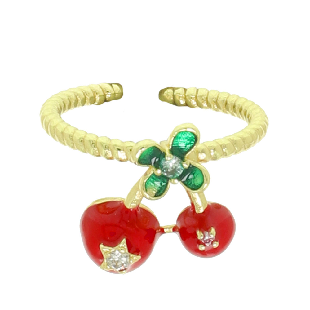 RED AND GREEN CRYSTAL EMBELLISHED ENAMEL CHERRY ADJUSTABLE ONE SIZE CUFF RING