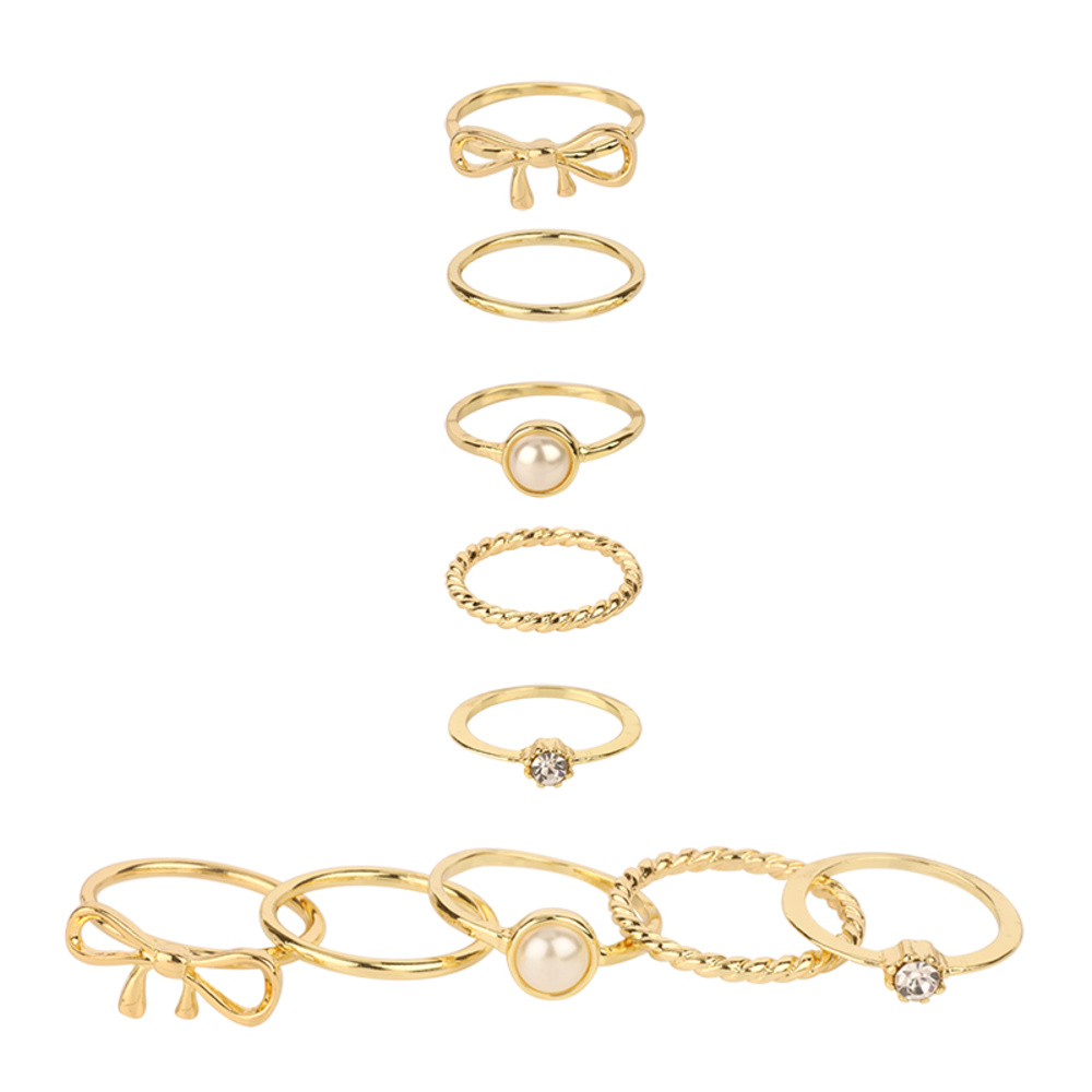 5PC ASSORTED STACKABLE BAND RING SET FEAUTRES PEARL AND CRYSTAL