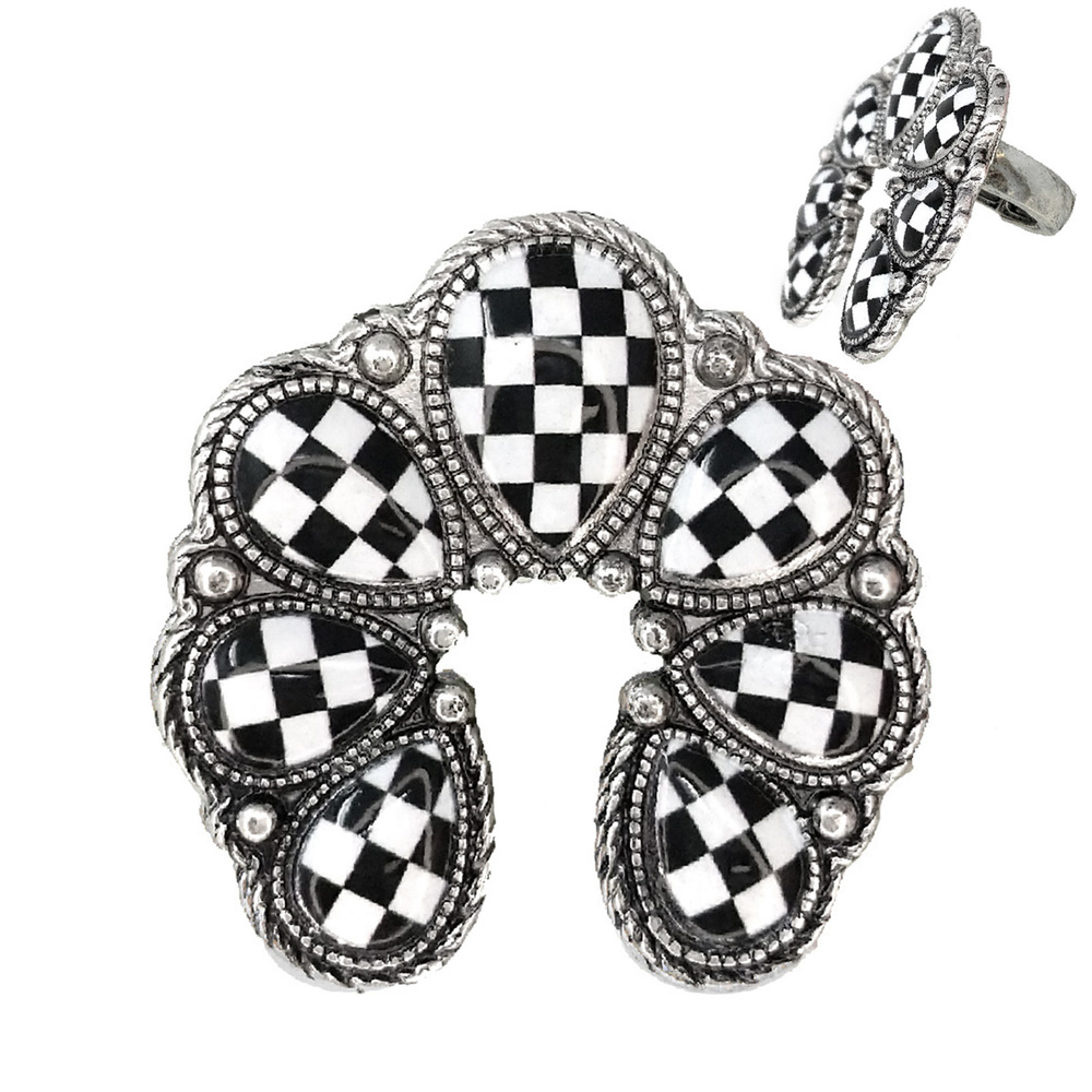 CHECKER FLAG PATTERN SQUASH BLOSSOM STRETCH RING IN OXIDIZED SILVER-TONE METAL