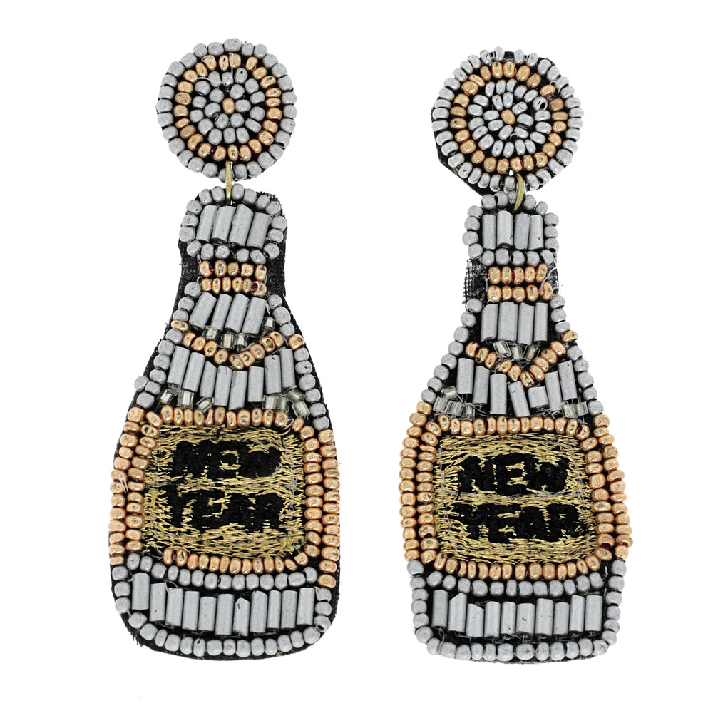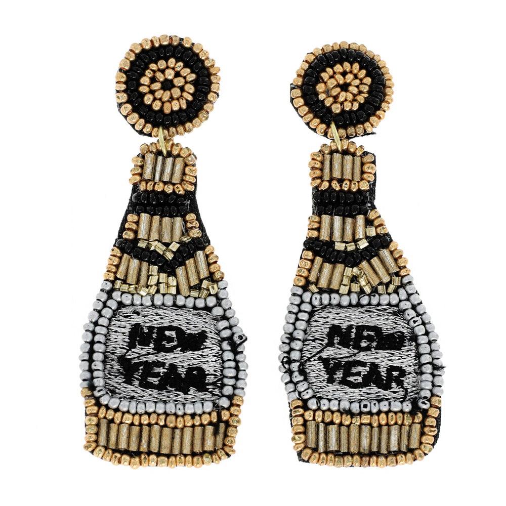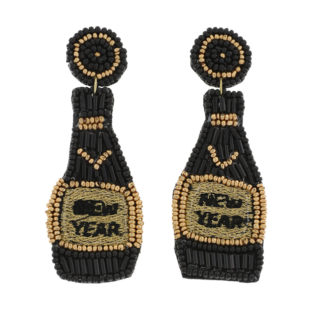 2-TIER SEED BEAD HANDMADE BEADED EMBROIDERY NEW YEARS CHAMPAGNE BOTTLE DANGLE AND DROP EARRINGS