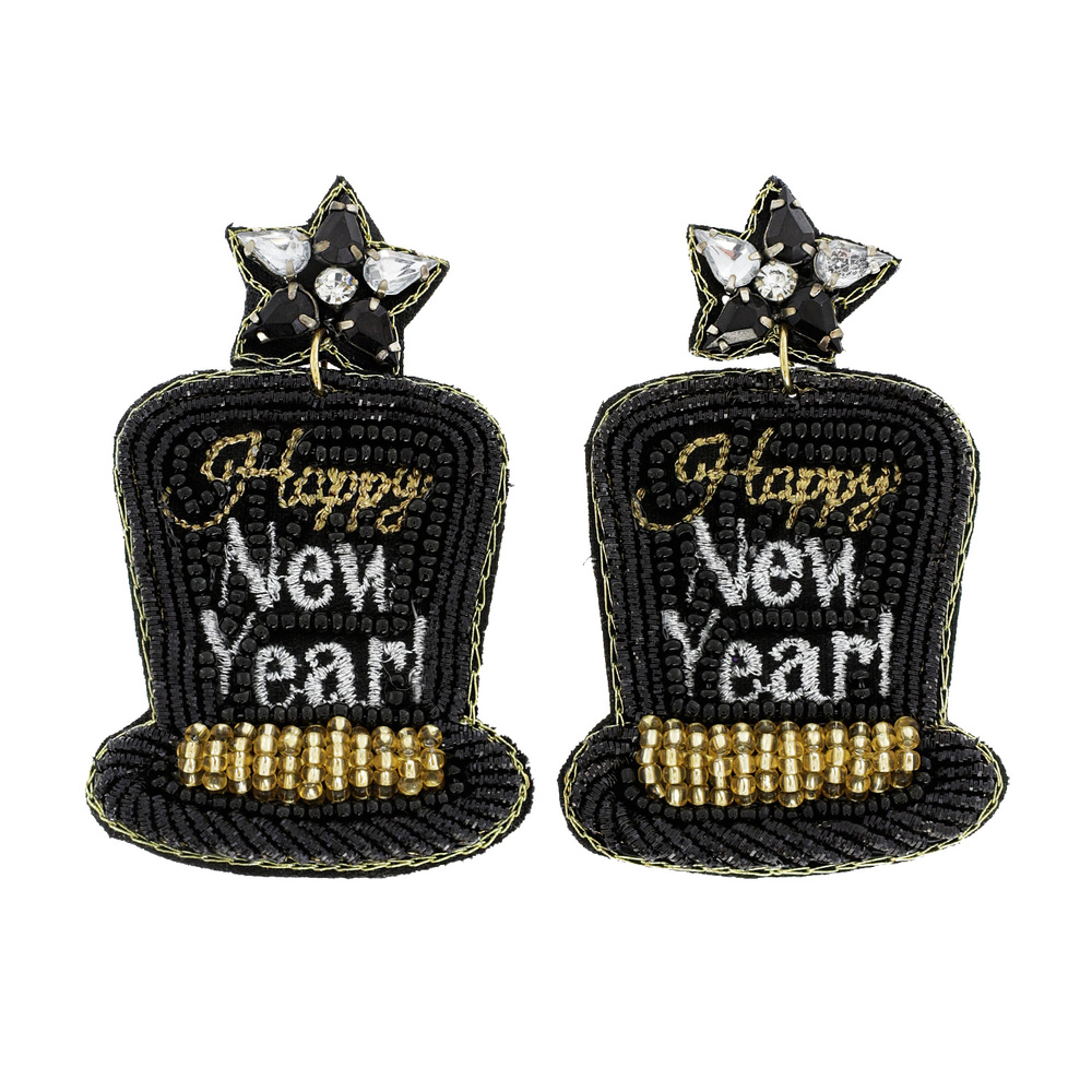 2-TIER JEWELED SEED BEAD HANDMADE BEADED EMBROIDERY HAPPY NEW YEARS PARTY TOP HAT DANGLE AND DROP EARRINGS