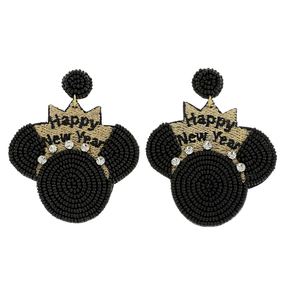 2-TIER JEWELED MOUSE WITH HAPPY NEW YEARS CROWN SEED BEAD HANDMADE BEADED EMBROIDERY DANGLE AND DROP NOVELTY EARRINGS