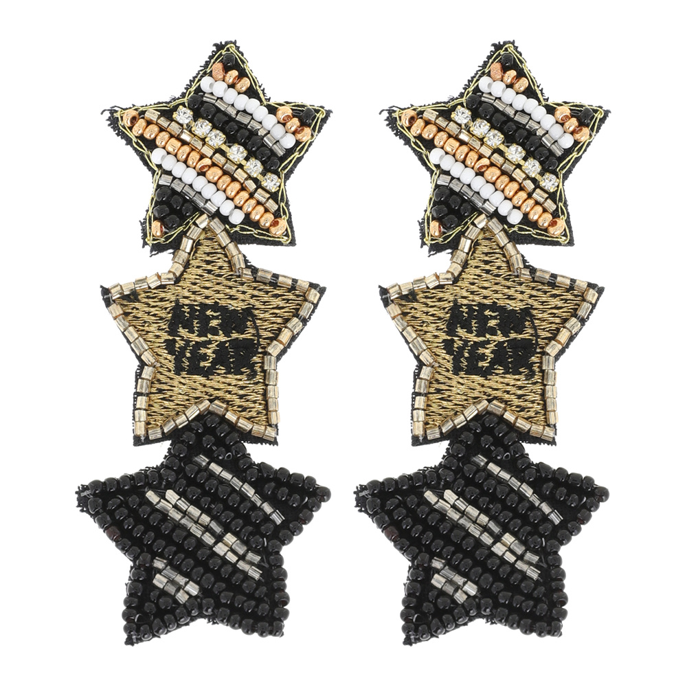 3-TIER JEWELED SEED BEAD HANDMADE BEADED EMBROIDERY HAPPY NEW YEARS STAR LONG DROP EARRINGS
