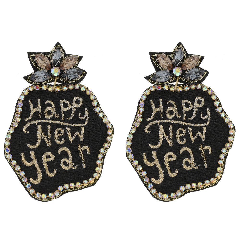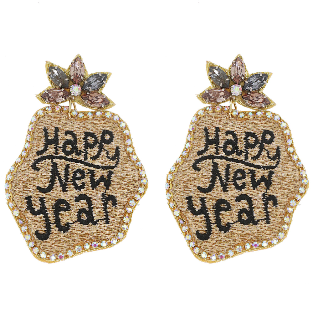 SEED BEAD HAPPY NEW YEARS HANDMADE JEWELED EMBROIDERY DANGLE AND DROP NOVELTY EARRINGS