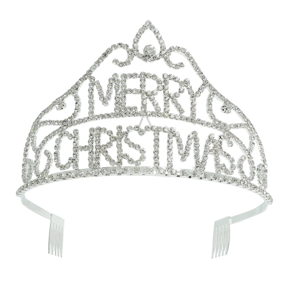 MERRY CHRISTMAS CRYSTAL RHINESTONE PAVE TALL TIARA CROWN WITH COMB BAND IN SILVER TONE METAL