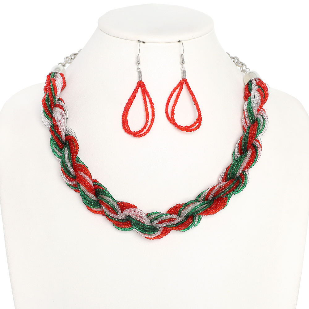 CHRISTMAS RED GREEN WHITE BEAD TORSADE NECKLACE DANGLE EARRING SET