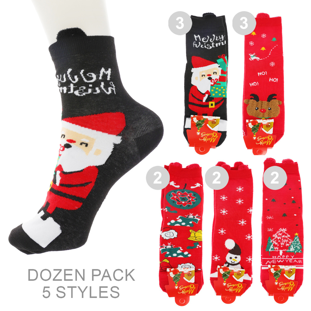 MERRY CHRISTMAS SANTA /HO-HO-HO/BELLS/ SNOWMAN/ CHRISTMAS TREE- 12 PACK 5 STYLES ASSORTED STOCKING STUFFER WINTER CHRISTMAS THEMED FLUFFY PUFFS NOVELTY COTTON SOCKS