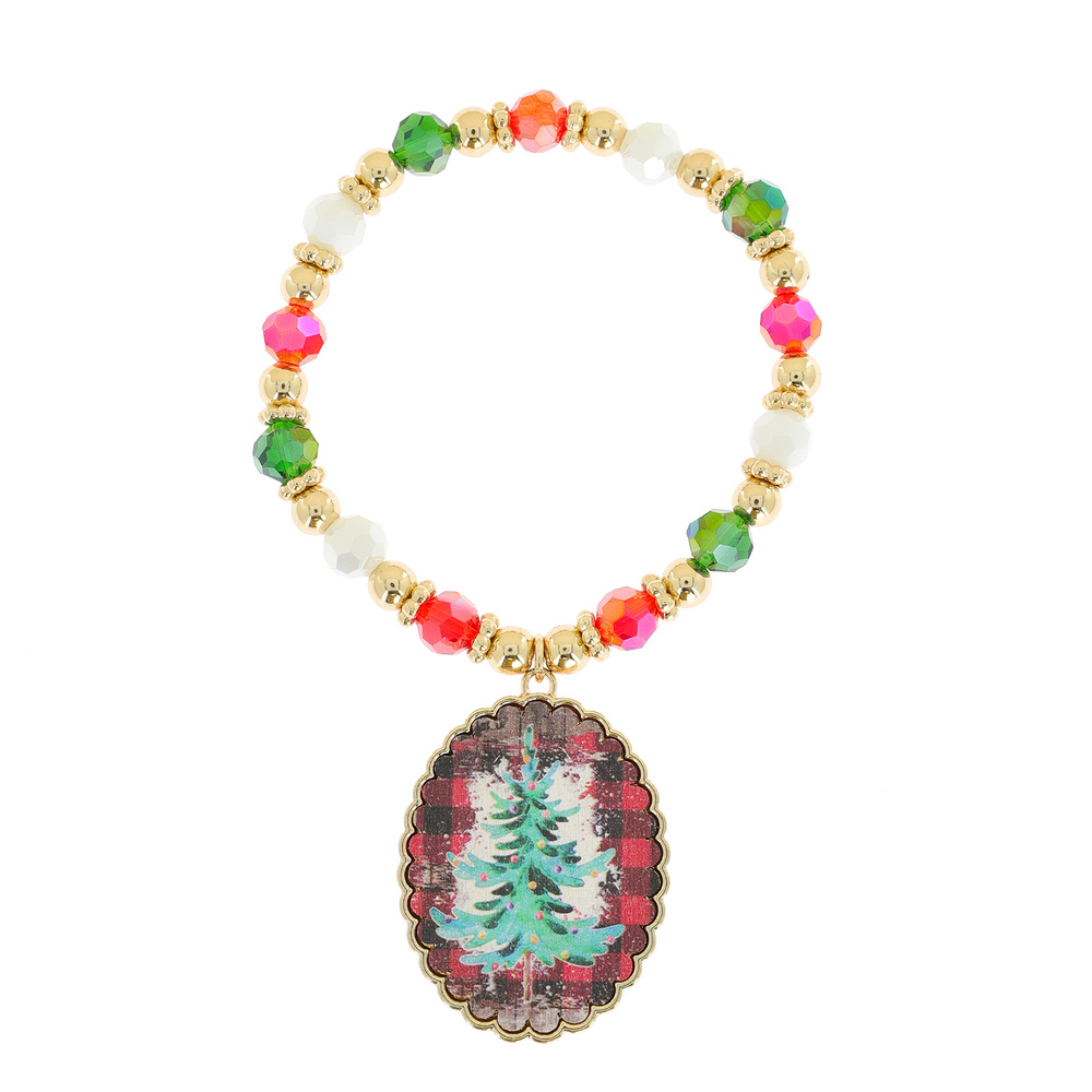 CHRISTMAS TREE - VINTAGE CHRISTMAS BEADED SCALLOPED FRAMED TARTAN PRINT RESIN CHARM STRETCH BRACELET