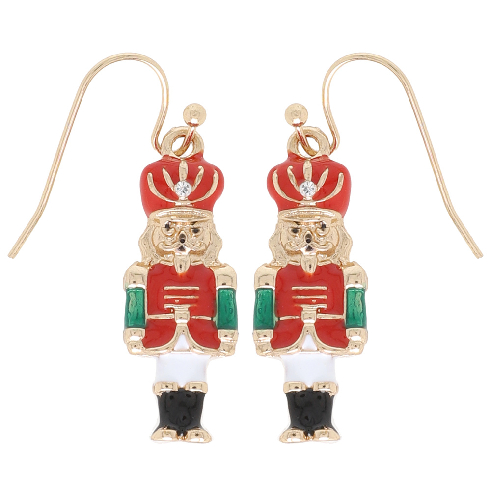 NUTCRACKER BALLET ENAMEL COATED CRYSTAL RHINESTONE DANGLE AND DROP HOOK EARRINGS IN GOLD TONE METAL