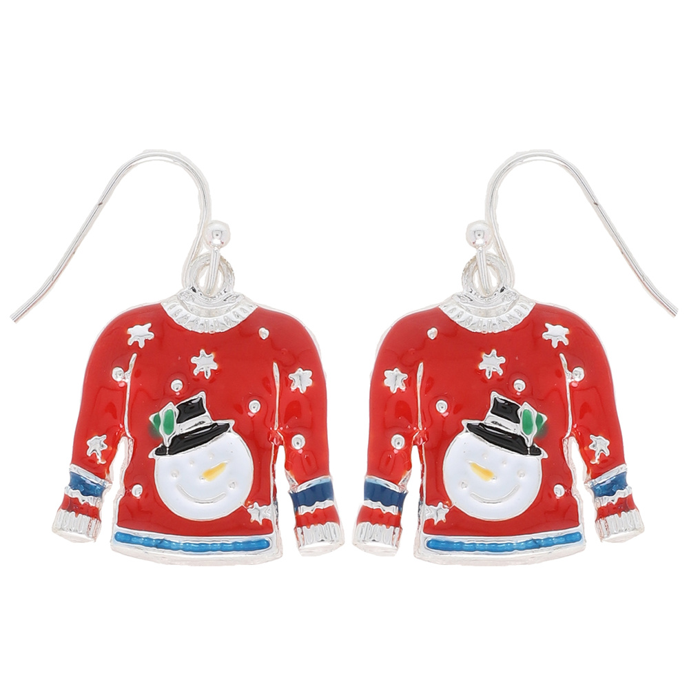 UGLY CHRISTMAS SWEATER ENAMEL COATED CRYSTAL RHINESTONE DANGLE AND DROP HOOK EARRINGS IN SILVER TONE METAL