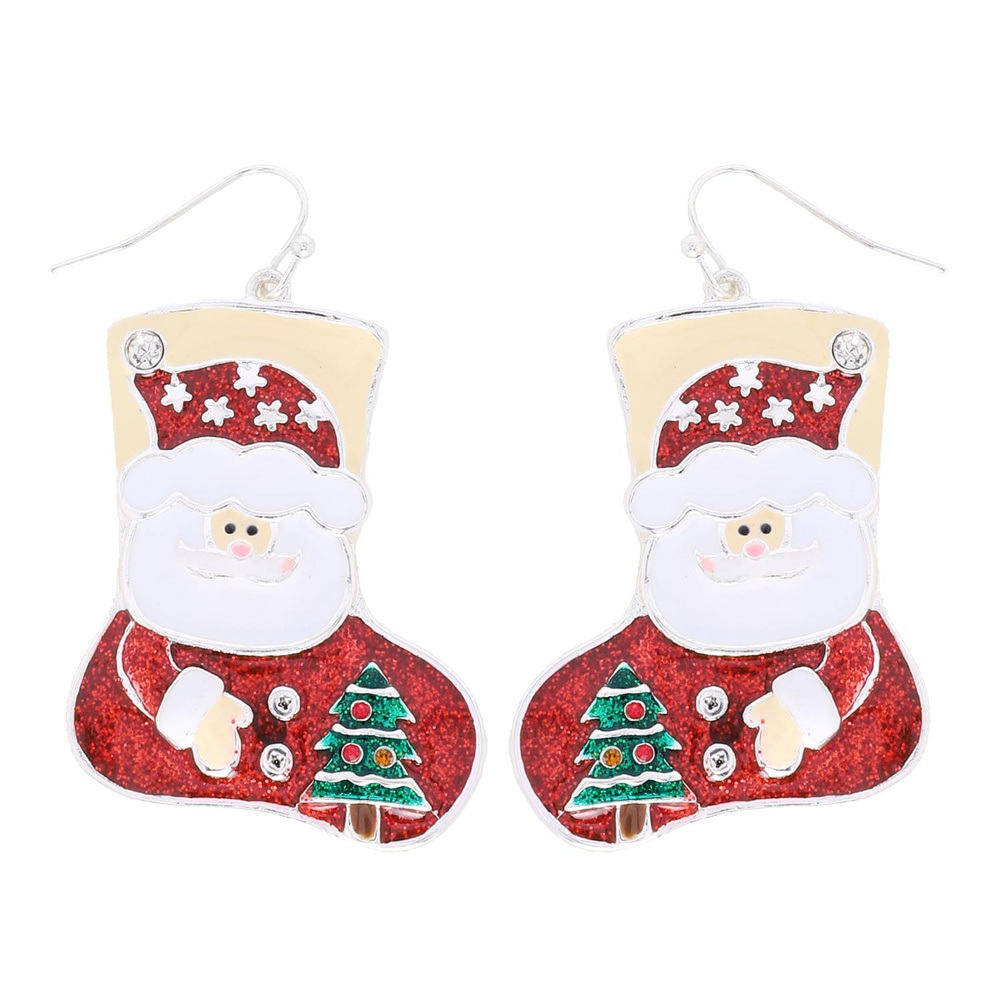 CHRISTMAS SANTA CLAUS STOCKING CRYSTAL RHINESTONE ENAMEL COATED DANGLE EARRINGS IN SILVER TONE METAL