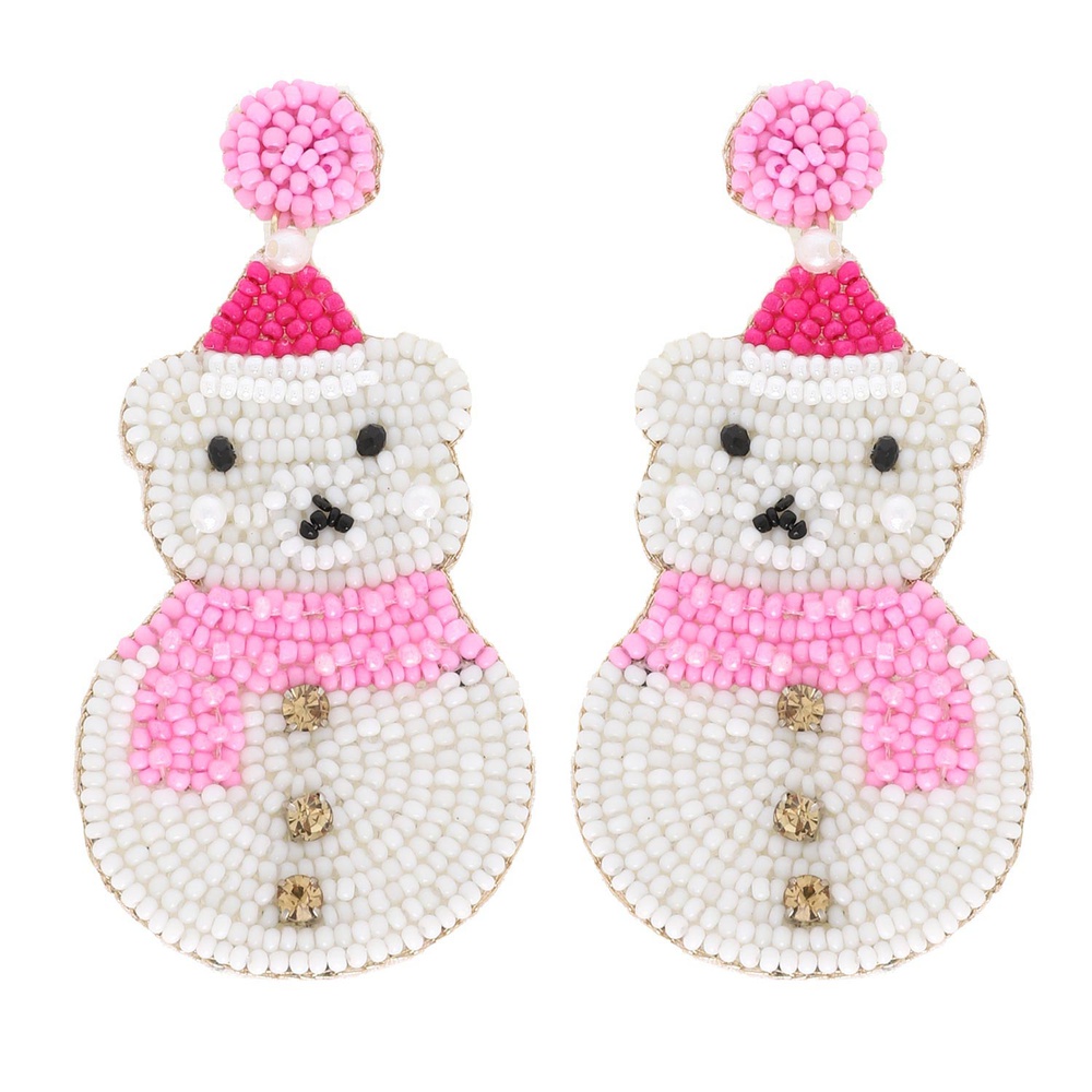 2-TIER POLAR BEAR SNOWMAN NOVELTY CHRISTMAS CRYSTAL RHINESTONE BEADED EMBROIDERY LONG DROP EARRINGS