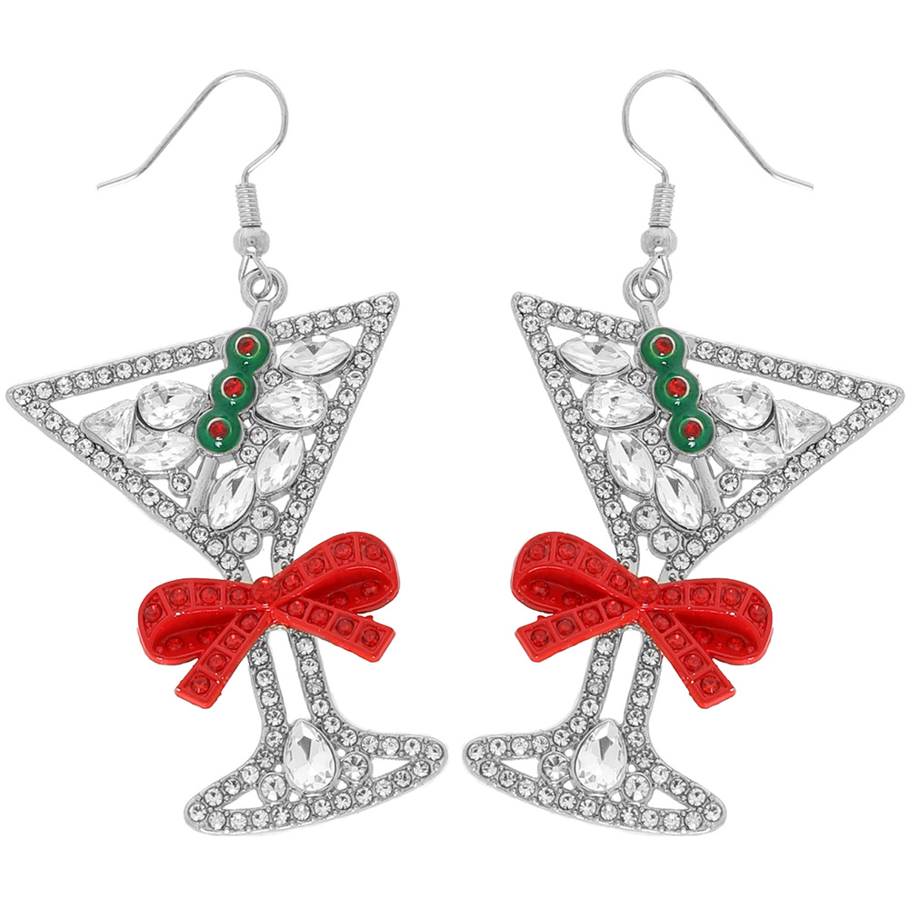 CHRISTMAS MARTINI CRYSTAL RHINESTONE ENAMEL COATED DANGLE FISH HOOK EARRING