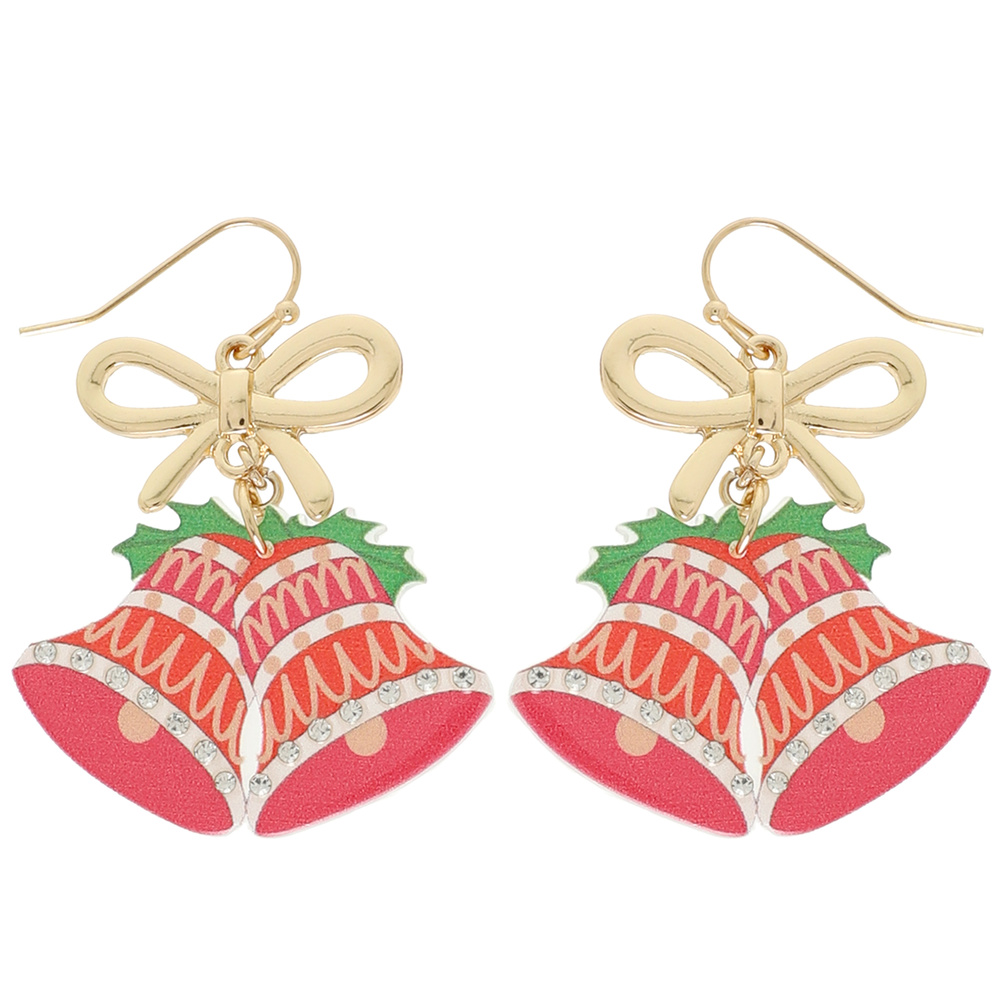 CHRISTMAS GLITTERED ACRYLIC RHINESTONE BELL DANGLE EARRINGS