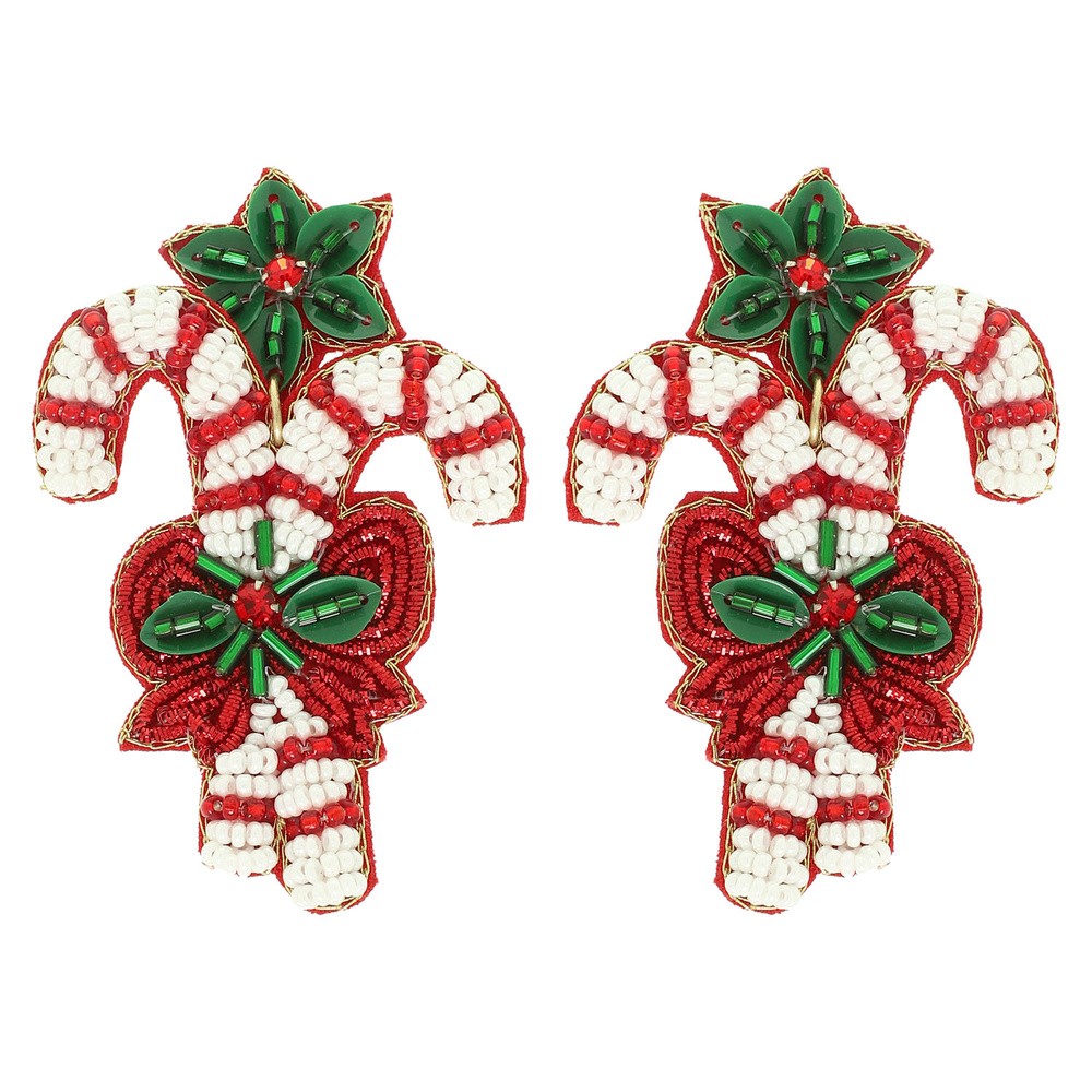 CHRISTMAS CANDY CANE CRYSTAL SEED BEADED POST DANGLE EARRINGS