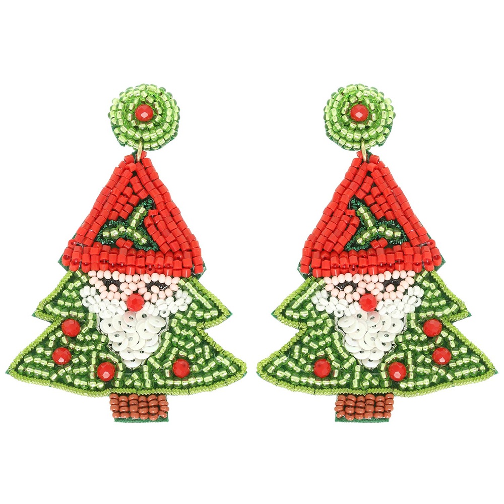 SEED BEADED CHRISTMAS SANTA TREE POST DANGLE EARRINGS
