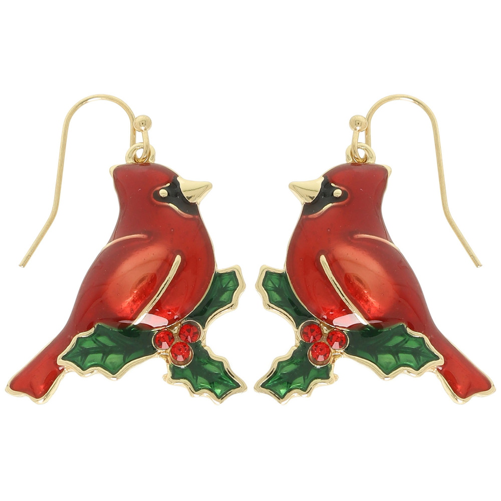CHRISTMAS CARDINAL SHAPED ENAMEL DANGLE EARRINGS WITH CRYSTAL ACCENTS