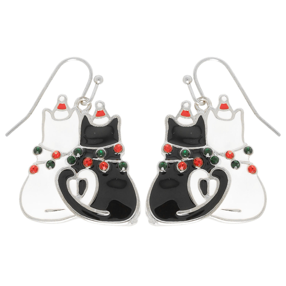 CHRISTMAS ENAMEL BLACK AND WHITE CAT PAIR DANGLE EARRINGS WITH HOLIDAY HAT AND LIGHT STRING RHINESTONES