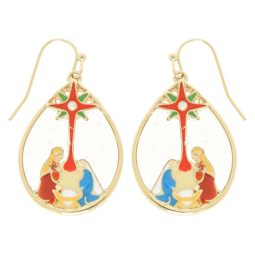 CHRISTMAS THEME NATIVITY SCENE TEARDROP DANGLE EARRINGS WITH COLORFUL ENAMEL DESIGN AND CRYSTAL STAR ACCENT
