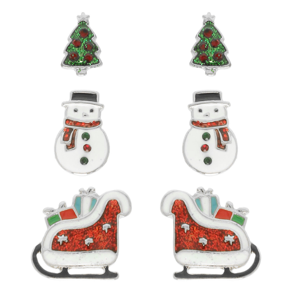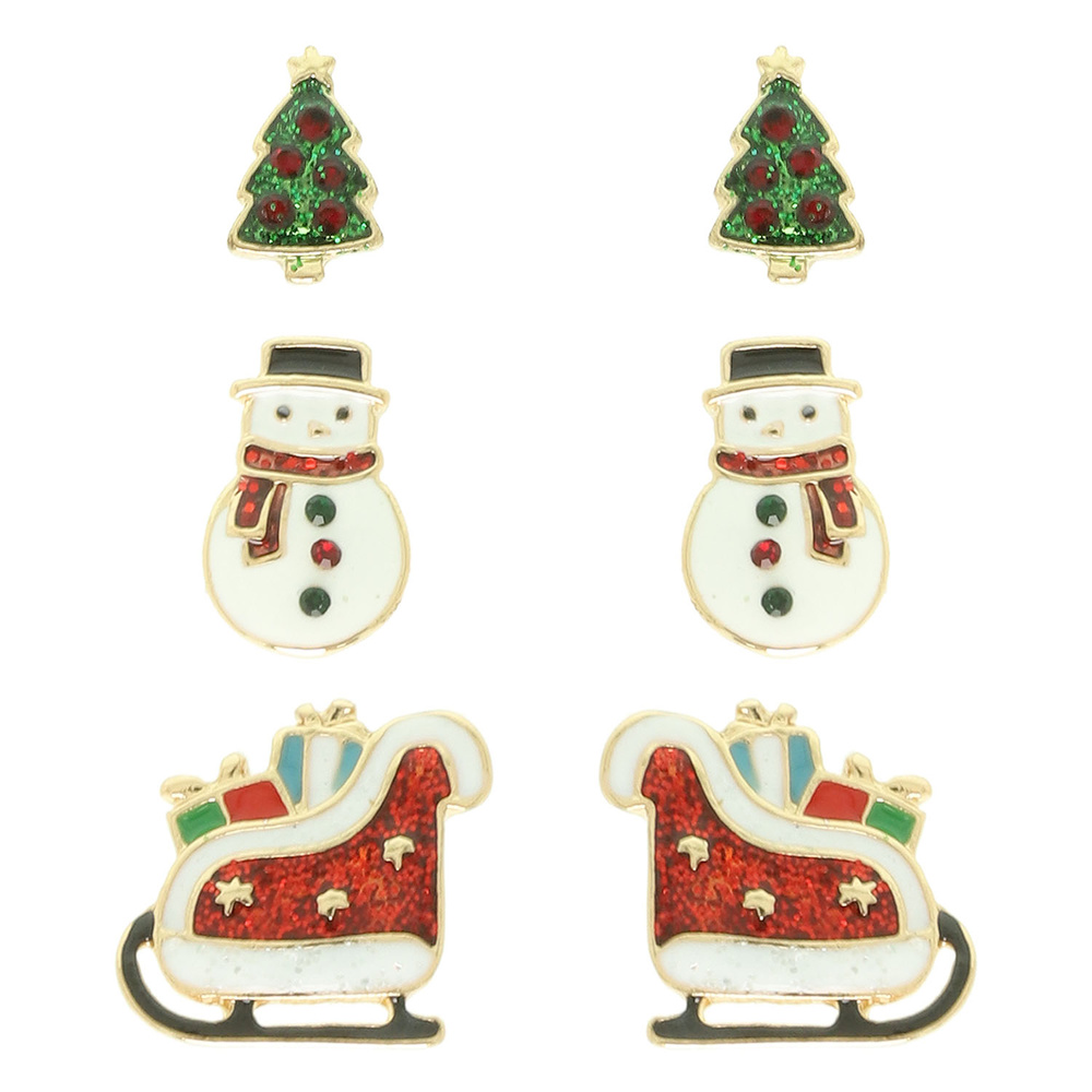 HOILDAY STUD EARRING SET WITH WITH CHRISTMAS TREE SNOWMAN AND SLEIGH DESIGN