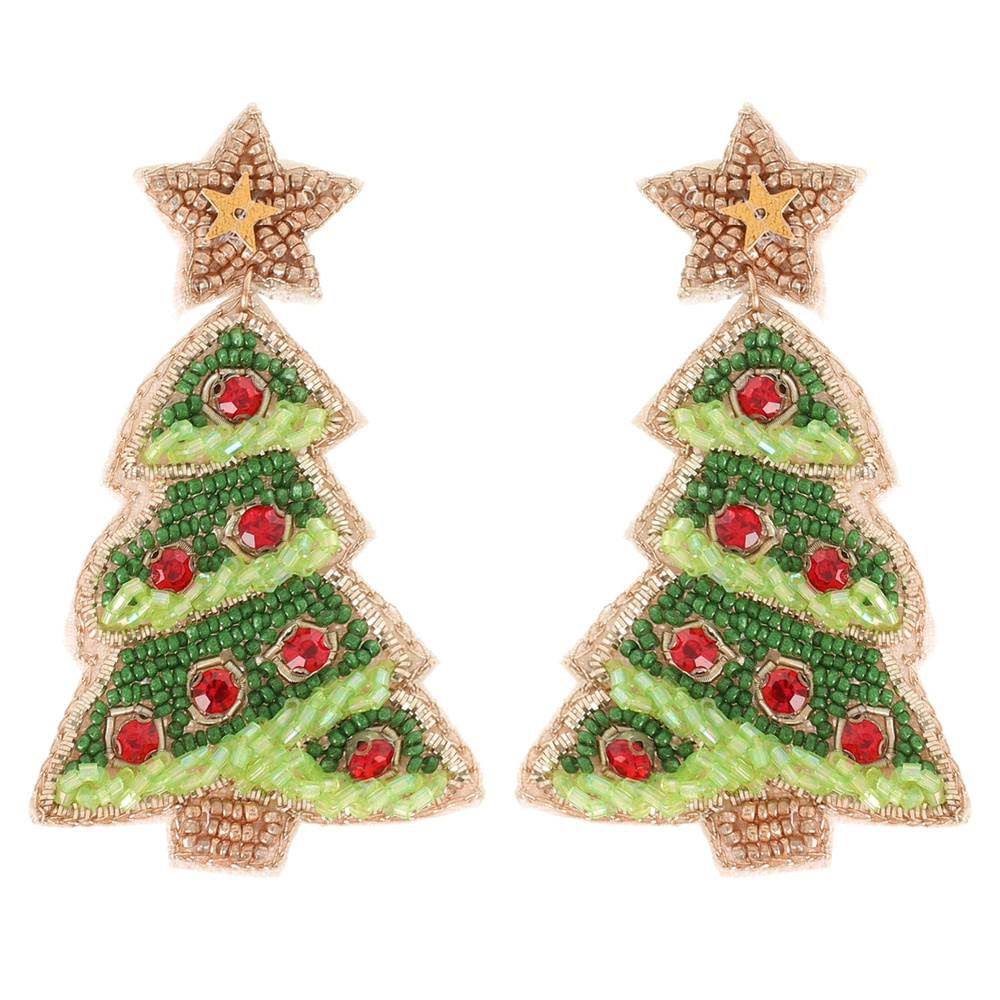 CHRISTMAS TREE SEED BEADED POST DANGLE EARRINGS WITH STAR TOPPER AND CRYSTAL ACCENTS