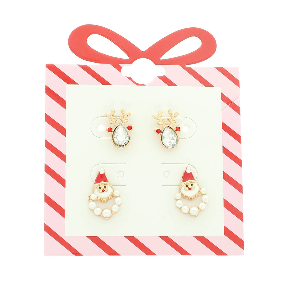 EARRING SET WITH PEARL ACCENTED SANTA AND CHRISTMAS REINDEER DESIGN WITH CRYSTAL ACCENTS