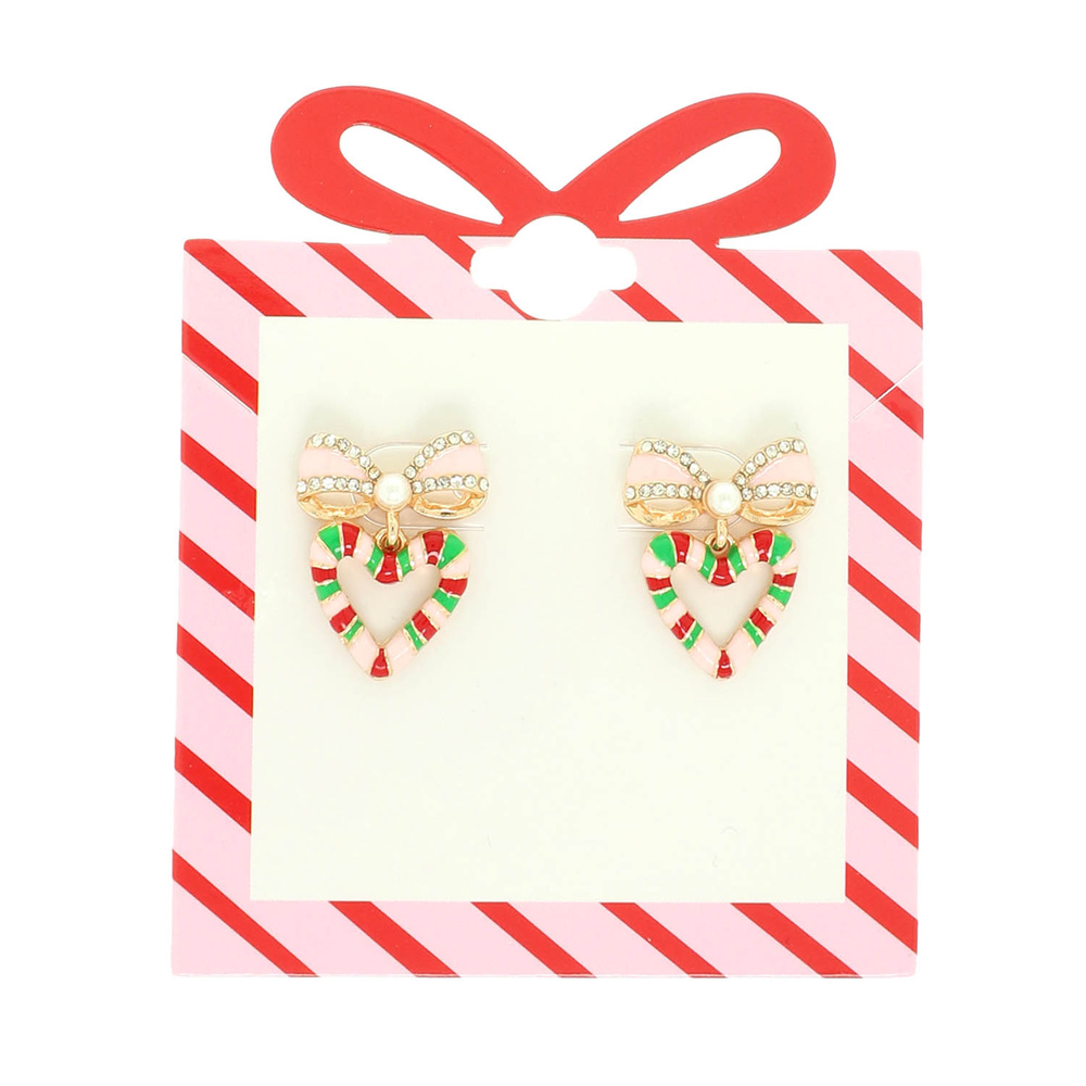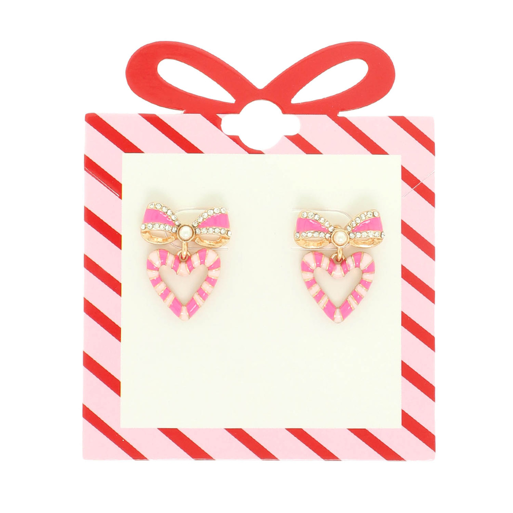 STRIPED CANDY PATTERNED ENAMEL BOWWED HEART POST EARRINGS WITH RHINESTONE PEARL ACCENTS