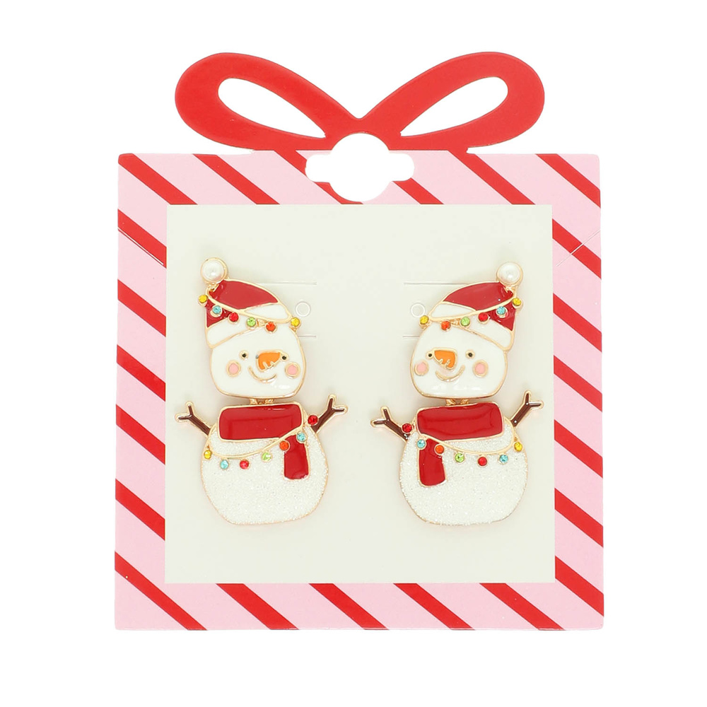 CHRISTMAS SNOWMAN ENAMEL POST EARRINGS WITH GLITTER RHINESTONE ACCENTS