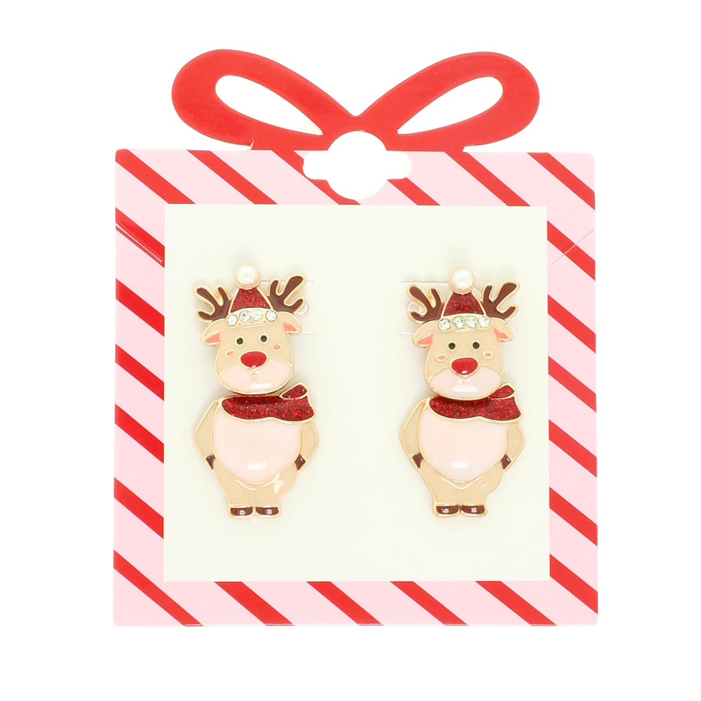 CHRISTMAS ENAMEL REINDEER POST EARRINGS WITH PEARL CRYSTAL GLITTER ACCENT