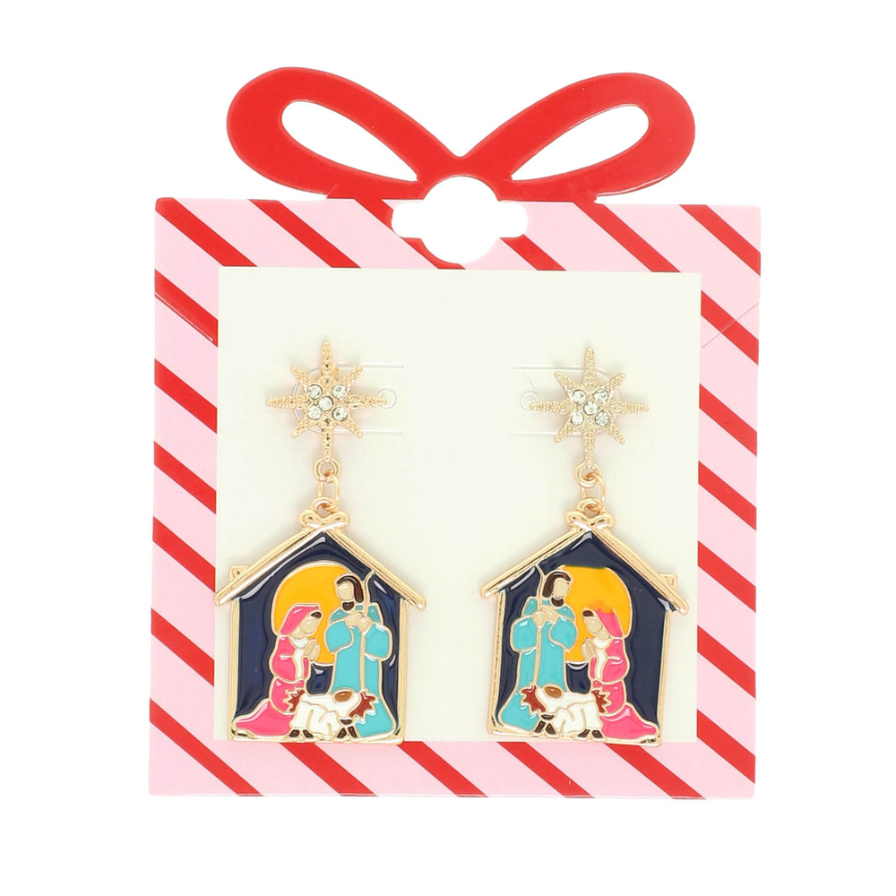 CHRISTMAS THEME NATIVITY SCENE POST EARRINGS ENAMEL DETAILED WITH CRYSTAL STAR ACCENT