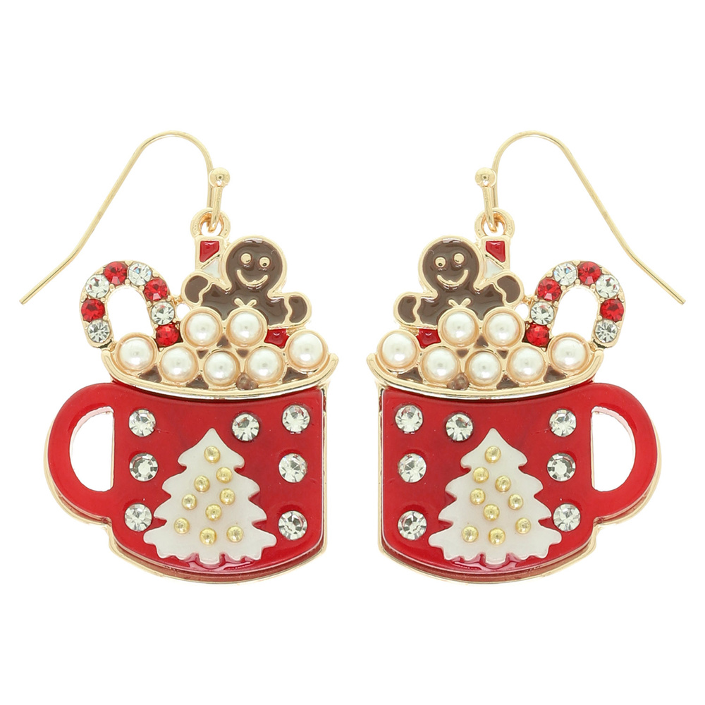 CHRISTMAS HOT COCO MUG EARRINGS WITH GINGERBREAD PEARL FOAM AND CRYSTAL PAVE CANDY CANE