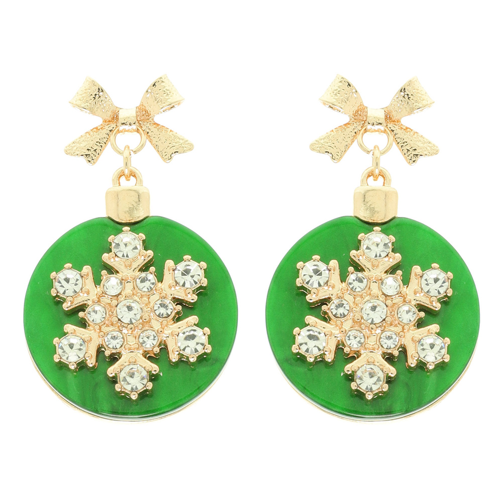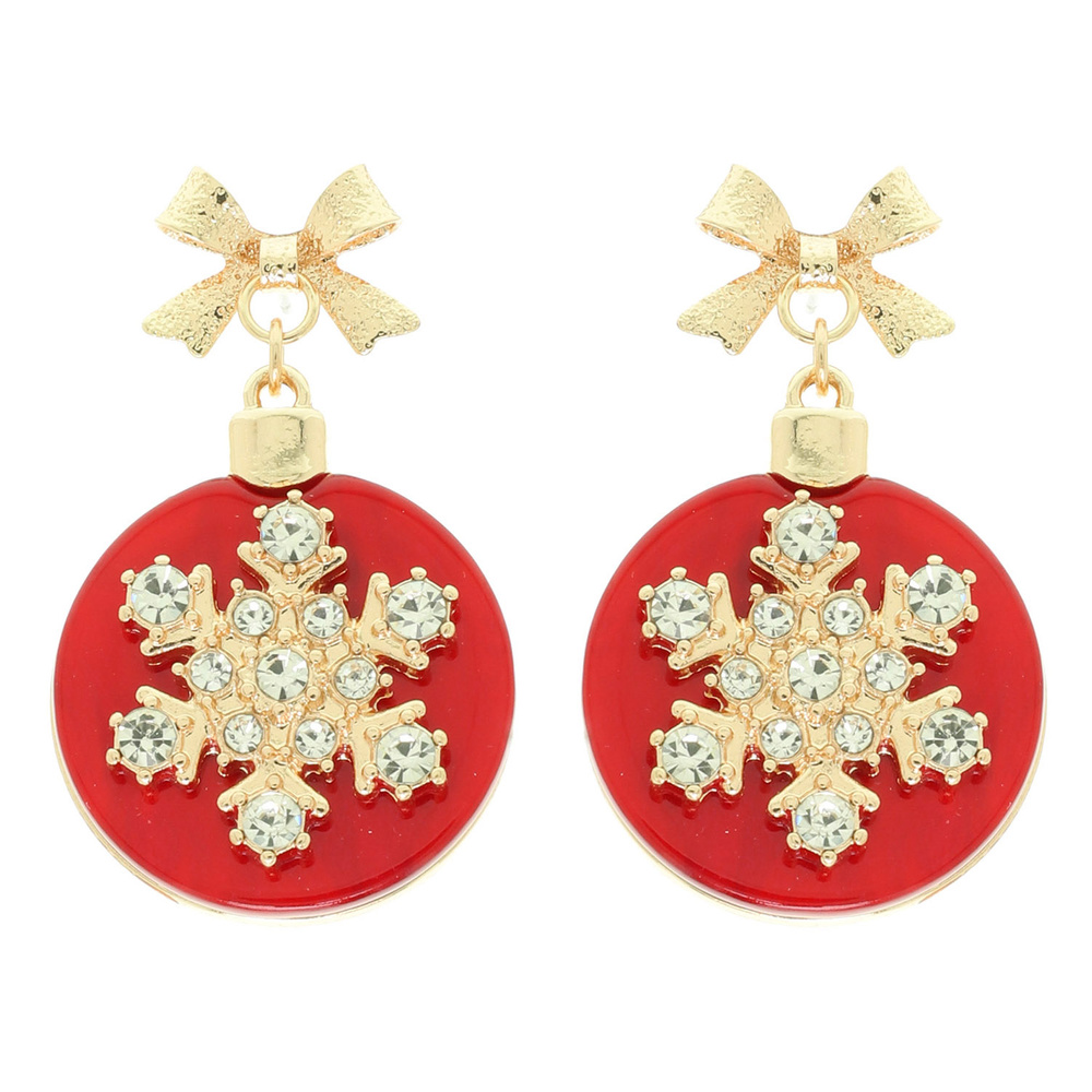 CHRISTMAS ORNAMENT SNOWFLAKE POST DANGLE EARRINGS WITH BOW TOP AND CRYSTAL ACCENTS