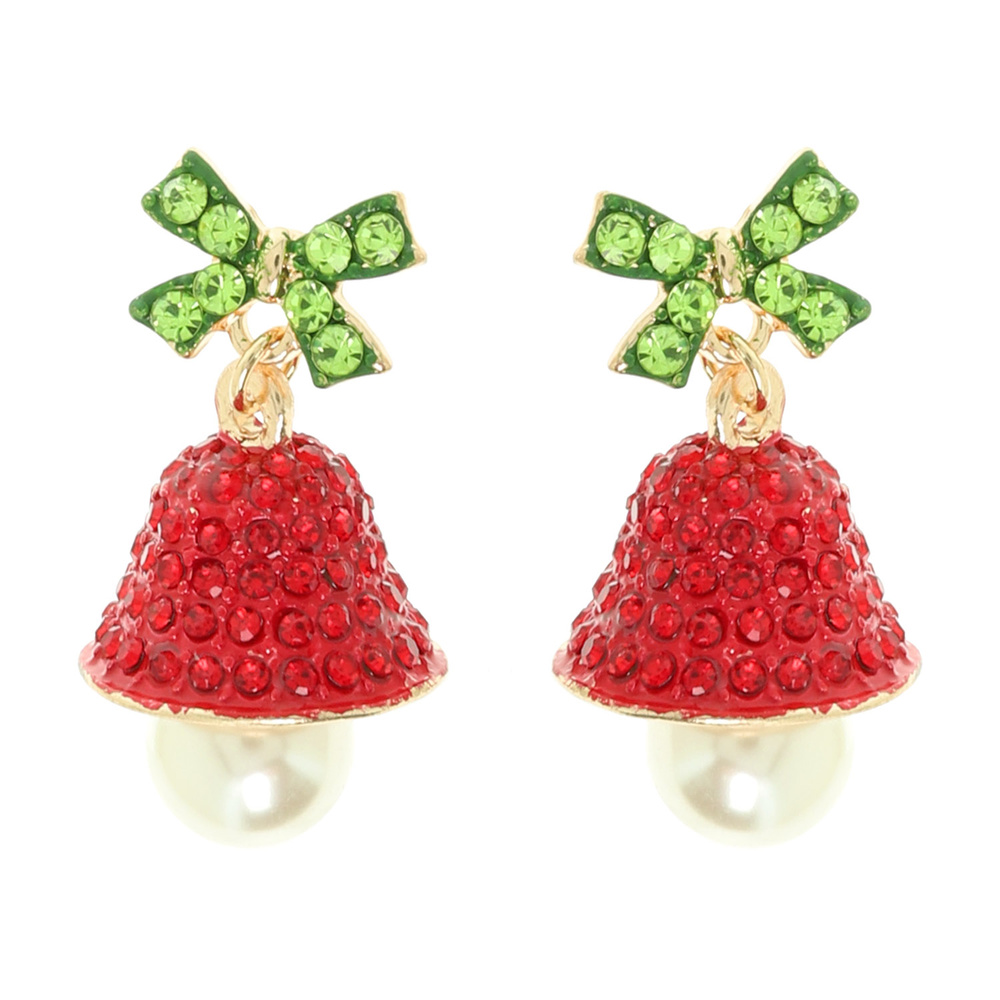 CHRISTMAS HOLLY BELL RHINESTONE PAVE POST DANGLE EARRINGS WITH PEARL ACCENT
