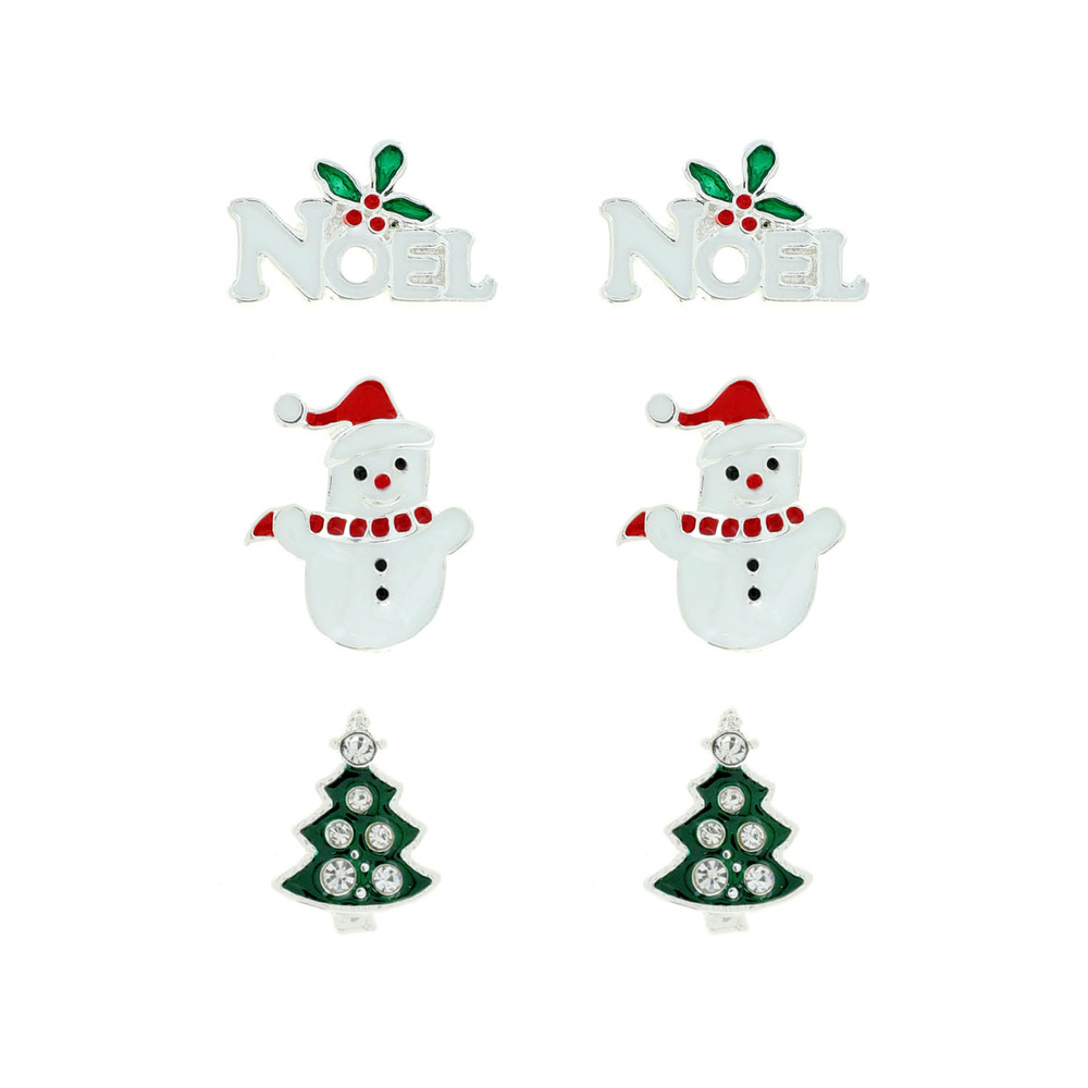 3pairs Christmas Noel, Snowman, Tree Post Earrings Set X Mas Seasonal Holiday Jewelry