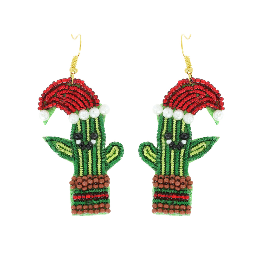 Christmas Santa Western Cactus Seed Bead Dangle Earrings X Mas Seasonal Holiday Jewelry